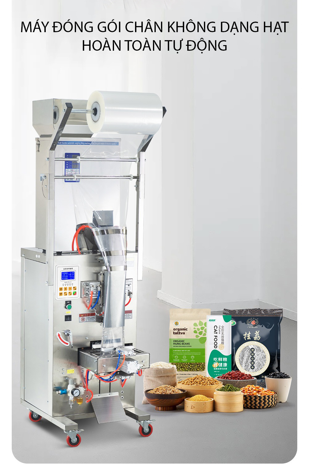 - Cấp liệu và định lượng: Sản phẩm được đưa vào phễu chứa và định lượng chính xác (bằng cân điện tử, cốc đong, hoặc vít tải tùy loại sản phẩm) vào túi/bao bì.
