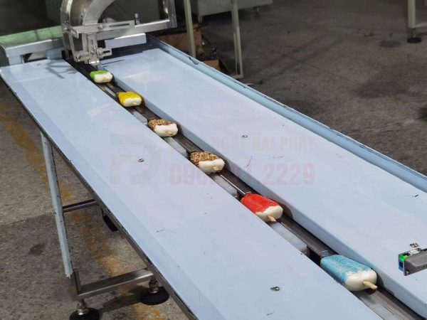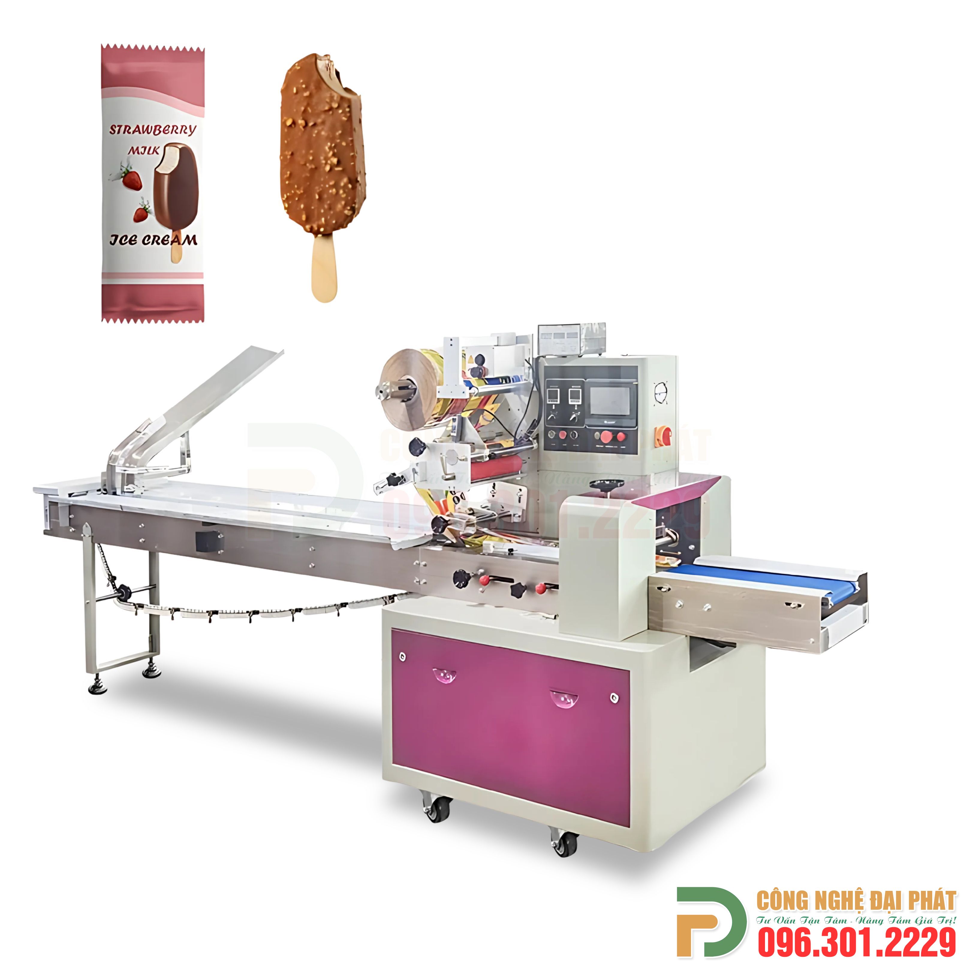 Máy đóng gói kem que (ĐGĐP-P47) là một dạng máy đóng gói ngang. Máy hoạt động bằng cách đưa từng chiếc kem que lên băng tải, bao bọc chúng trong một cuộn màng co nhiệt liên tục, sau đó hàn kín và cắt rời thành từng gói. Toàn bộ quá trình diễn ra tự động, giúp đảm bảo vệ sinh và tốc độ sản xuất cao.