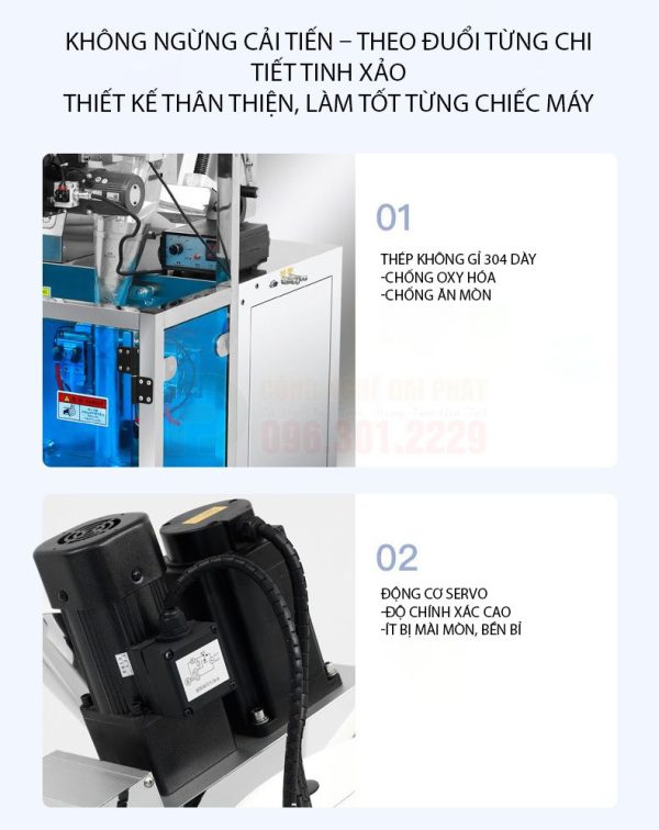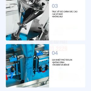 - Bộ phận tạo túi và hàn kín (tích hợp): Sau khi sản phẩm được định lượng và xả xuống, máy sẽ tự động tạo túi từ cuộn màng, hàn kín miệng túi và cắt rời.