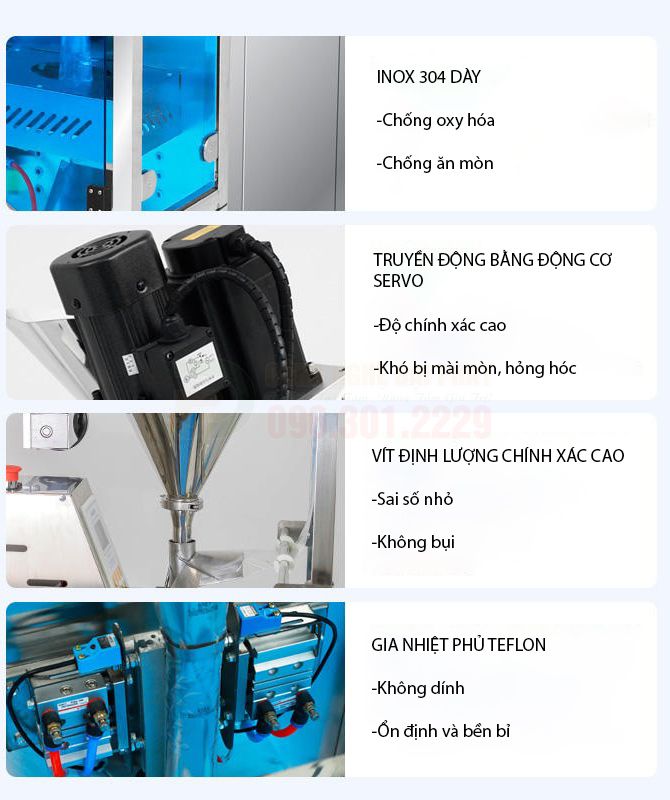 - Động cơ và hệ thống điều khiển: Điều khiển tốc độ quay của trục vít và thời gian hoạt động để định lượng chính xác sản phẩm. Hệ thống điều khiển PLC và màn hình cảm ứng giúp người vận hành cài đặt trọng lượng, tốc độ.
